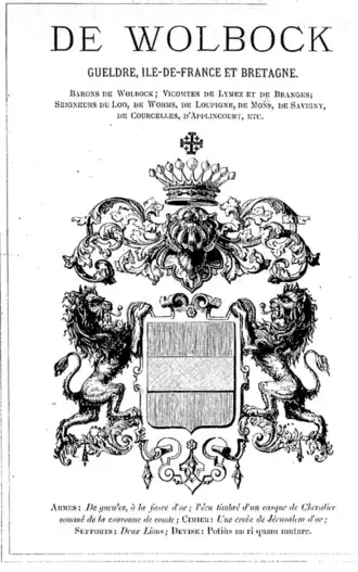 Antoine fils de Nicolas de Wolbock, exempt des gardes du corps du Roi Louis XIII et gentilhomme servant de la Reine en 1617, fut appelé à l'arrière-ban de Soissons en 1635[7]. Il est vicomte de Limé, (Aisne). François de Wolbock, maintenu noble en Soisonnais le 18 juillet 1667, épouse, le 13 juillet 1659, Marguerite de Chatillon d'Harzillemont. Louis-Antoine, gouverneur d'Avesne avant 1754. Louis-François-Armand de Wolbock, vicomte de Limé, blessé à Fontenoy le 11 mai 1745. Jean-Louis-Armand, inspecteur général de la maison des rois louis XVIII et Charles X[8].