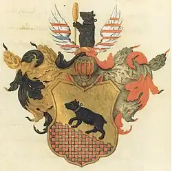 Un ours noir marchant avec un collier argenté en or sur un mur crénelé diagonal rouge et argent. Sur le casque aux lambrequins noires et dorées à droite et rouges et argentées à gauche, l'ours grandit, tenant une rame dorée dans ses pattes entre un vol ouvert de hérons argentés. L'aile droite a 4 bandes (rouge, rouge, bleu, rouge), l'aile gauche a six bandes rouges.