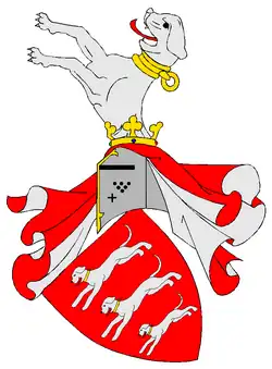 Les armoiries de la famille montrent trois fougères argentées en rouge, les unes au-dessus des autres, s'étendant vers la droite avec des colliers cerclés d'or. Sur le casque aux lambrequins rouges et argentés, une des fougères poussant à droite[8].