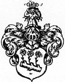 En argent, une branche naturelle allongée et tronquée d'où poussent trois roses rouges sur des tiges de feuilles vertes. Sur un casque avec une couverture rouge et argent, pousse une vierge vêtue de rouge, avec une couronne verte ornée de plumes d'autruche or, rouge et argent sur la tête.