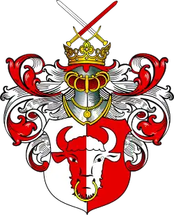 Les armoiries familiales montrent une tête de buffle tournée vers l'avant de couleurs alternées dans un bouclier divisé entre le rouge et l'argent. Sur le casque aux lambrequins rouges et argentés se trouvent deux épées aux poignées dorées, celle de droite nue, celle de gauche dans un fourreau rouge[5].