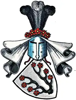 Les armoiries de la famille montrent en argent un bois de cerf noir, dont les huit échelons sont ornés de roses rouges. Sur le heaume aux lambrequins noir-argent (également rouge-argent à droite, noir-argent à gauche), une couronne de cinq roses rouges d'où dépassent trois plumes d'autruche (noir, argent, rouge ou noir, argent, noir).[réf. nécessaire]