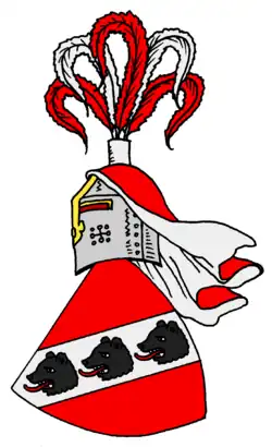 Les armoiries originales de la famille montrent en rouge une barre oblique argentée surmontée de trois têtes d'ours noires. Sur le casque avec des lambrequins rouges et argentées, un buisson de plumes de coq alternativement rouges et argentées[1]. Otto Titan von Hefner écrit dans Siebmachers Wappenbuch de 1857 : "En raison de l'ignorance des principes héraldiques ou simplement en raison d'une incompréhension des couleurs, la barre oblique en argent a été plus tard (dès Siebmacher III. 140) peinte en bleu et elle est à tort le cas maintenant. "