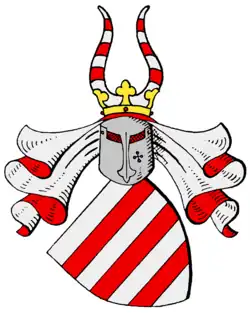 Les armoiries de la famille comportent trois barres rouges en argent. Sur le casque aux lambrequins rouges et argentées, deux cornes de buffle marquées comme l'écu[6]