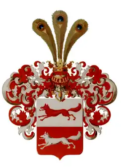 Le blason de la famille montre une fasce de gueules sur champ d'argent accompagnée de deux renards roux en fuite. Sur le casque avec des couvertures rouges et blanches, trois lances de bâillon en fer avec des tiges dorées se déploient sur trois roses (blanche, rouge et blanche).