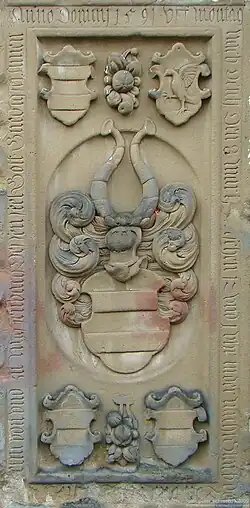 Les armoiries de la famille montrent deux barres dorées en bleu. Sur le casque aux lambrequins bleu et or figurent deux cornes de buffle inscrites comme le bouclier.