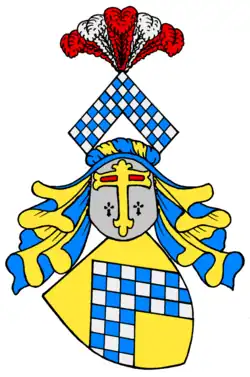 Les armoiries de la famille représentent un chevron d'or quadrillé d'argent et de bleu sur trois rangées. Sur le casque à coques bleues et dorées, le chevron est décoré de cinq plumes d'autruche alternées rouges et argentées[6].