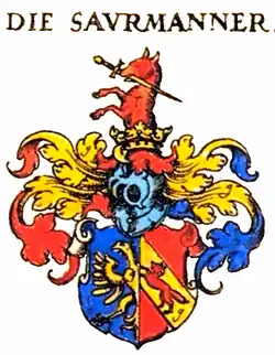 Cette famille est originaire de Gefrees près de Berneck, en Haute-Franconie, et s'installe à Breslau, en Basse-Silésie, en 1420 avec le marchand Conrad Sauermann. En 1508, le marchand, conseiller, échevin et patricien de Breslau, Konrad Sauermann, fait l'acquisition du domaine seigneurial de Jeltsch et entame l'ascension familiale. En 1518, il y fait construire le château de Jeltsch (de), dans un style Renaissance, mais qui est endommagé pendant la guerre de Trente Ans et qui le pousse à se faire construire un nouveau château, sur une île de l'Oder, baptisé château de Jeltsch-Laskowitz (de). Le 29 août 1530, Konrad Sauermann est anobli, avec augmentation des armoiries, et ses descendants sont élevés au rang de baron du Saint-Empire en 1647 (sous le nom de Saurma von und zu der Jeltsch).