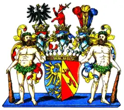 - Les armoiries de 1846 (lignées de Ruppersdorf et Zülzendorf) montrent dans un écu fendu à droite en bleu un demi-aigle royal sur la fente, à gauche en rouge dans une barre droite oblique dorée un renard naturel courant. Trois casques : à droite avec une couverture rouge et or un aigle noir couronné d'or et blindé, au milieu avec une couverture rouge et or à droite et bleu et or à droite le renard poussant avec un flan à pointe d'or épée dans ses crocs, à gauche avec couverture bleu-or trois plumes d'autruche (rouge-or-bleu). Porte-boucliers : deux hommes sauvages tournés vers l'avant avec des couronnes vertes sur la tête et les reins, chacun s'appuyant sur une massue avec leurs mains libres[2].