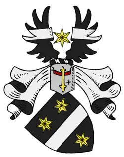 Les diplômes individuels et les promotions étaient également associés à des améliorations ou à des changements d'armoiries. Selon l'auteur de la chronique familiale, le blason familial est d'origine hongroise. Selon lui, la bande horizontale argentée traversant l'écu représente le Danube. Dans le bouclier noir, les deux étoiles dorées au-dessus de la bande horizontale sont les parents et l'étoile dorée en dessous est l'enfant, qui a pu fuir le danger. Sur le casque avec des couvertures noires et argentées, une étoile dorée entre un vol noir ouvert, chacun recouvert d'une bande horizontale argentée.