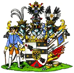 Le blason des comtes de 1742 est écartelé et recouvert d'un bouclier de cœur doré couronné d'un comte, à l'intérieur un aigle à deux têtes noir blindé et auréolé d' or avec une cuirasse (bavaroise) renforcée d'argent et de bleu, dans les champs 1 et 4 en argent une tête de dogue noir à surface rouge découpée, une flèche rouge dévorante, les champs 2 et 3 comme blason de famille, inséré entre les champs 3 et 4 une pointe violette, dans celle-ci une pyramide de 15 grenades en fer, celle du haut est brûlant; trois casques : à droite avec des couvertures noires et argentées trois plumes de coq argentées, au milieu avec des couvertures noires et argentées à droite, des couvertures bleues et argentées à gauche de l'aigle double, ici couronné impérial de bandes rouges volantes frangées de or, à gauche avec des couvertures noires et dorées du casque d'armoiries de la tribu avec l'étoile entre le vol; Porte-bouclier : A droite un mitrailleur en habit bleu à revers de col et boutons dorés et chapeau noir, la main droite appuyée sur une tige détonante, la gauche tenant son bouclier, sur les ferrures de gauche[1].