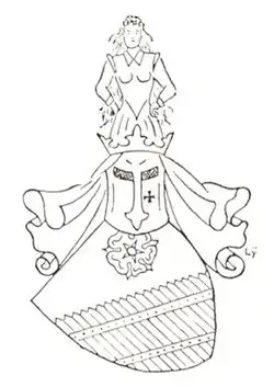 En argent, une palissade rouge inclinée vers la droite, surmontée d'une rose rouge. Sur le casque avec des lambrequins rouges et argentées, une jeune fille en pleine croissance vêtue de rouge avec des cheveux lâches et un bandeau vert.
