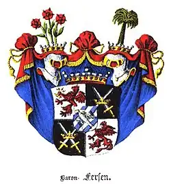 Les armoiries baronniales (Fersen 1674) sont divisées en quartiers et recouvertes d'un bouclier en forme de cœur en argent avec trois banderoles diagonales bleues, recouvertes par le poisson ailé des armoiries familiales. Champs 1 et 4 en argent un griffon rouge avec quatre flèches d'or dans la main droite, champs 2 et 3 en noir une couronne d'or à travers laquelle sont plantées deux épées. Deux casques avec des armoiries rouges bordées de bleu et d'or, à droite comme les armoiries de la famille, à gauche un palmier vert[5].