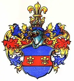 Le blason[6] montre une fasce de gueules couverte de deux fleurs de lys dorés en bleu. Un lys doré sur le casque avec des lambrequins bleues, de gueules et dorées[7].