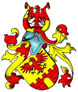 Le blason représente un aigle rouge en or sur un mur rouge avec une porte. Sur le casque aux couvertures rouges et dorées, l'aigle rouge entre deux cornes de buffle divisées en diagonale par de l'or sur du rouge.