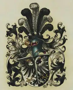 Les armoiries familiales sont partagées entre le noir et l'argent, avec un aigle bicéphale armé d'or et de couleur confondue. Le casque, dont les lambrequins sont noir et argent, est orné de sept plumes d'autruche alternativement noires et argentées. Historiquement, il existe également des variantes avec une succession de couleurs inversées.