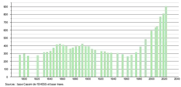 L'évolution du nombre d'habitants est connue à travers les recensements de la population effectués dans la commune depuis 1793. Pour les communes de moins de 10 000 habitants, une enquête de recensement portant sur toute la population est réalisée tous les cinq ans, les populations de référence des années intermédiaires étant quant à elles estimées par interpolation ou extrapolation[13]. Pour la commune, le premier recensement exhaustif entrant dans le cadre du nouveau dispositif a été réalisé en 2008[14].