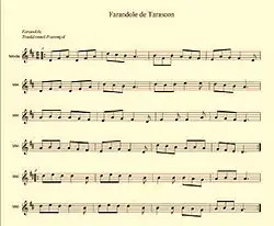 Ces indications sont reprises tant par le Centre national de ressources textuelles et lexicales[5], que par le Trésor de la langue française)[6]. Seule l'Encyclopédie Universalis développe : « Danse populaire provençale (farandoulo), sur une mesure à ![]()