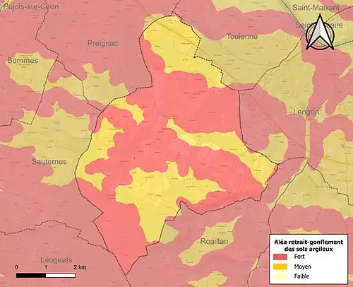 Le retrait-gonflement des sols argileux est susceptible d'engendrer des dommages importants aux bâtiments en cas d’alternance de périodes de sécheresse et de pluie. La totalité de la commune est en aléa moyen ou fort (67,4 % au niveau départemental et 48,5 % au niveau national). Sur les 723 bâtiments dénombrés sur la commune en 2019, 723 sont en aléa moyen ou fort, soit 100 %, à comparer aux 84 % au niveau départemental et 54 % au niveau national. Une cartographie de l'exposition du territoire national au retrait gonflement des sols argileux est disponible sur le site du BRGM[24],[Carte 2].