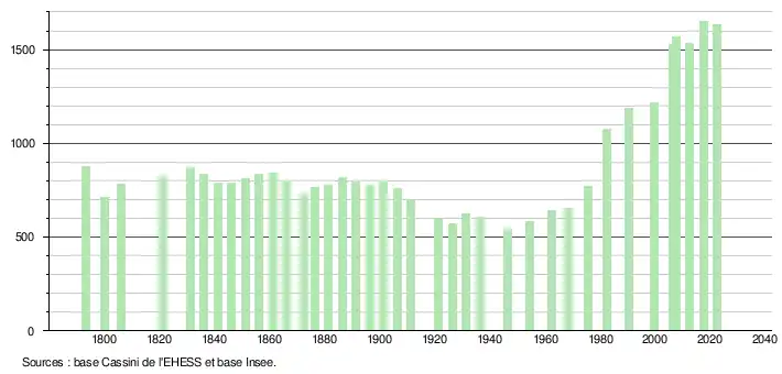 L'évolution du nombre d'habitants est connue à travers les recensements de la population effectués dans la commune depuis 1793. Pour les communes de moins de 10 000 habitants, une enquête de recensement portant sur toute la population est réalisée tous les cinq ans, les populations de référence des années intermédiaires étant quant à elles estimées par interpolation ou extrapolation[30]. Pour la commune, le premier recensement exhaustif entrant dans le cadre du nouveau dispositif a été réalisé en 2007[31].