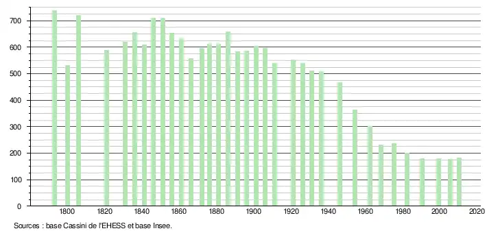 - ↑ Par convention dans Wikipédia, le principe a été retenu de n’afficher dans le tableau des recensements et le graphique, pour les populations légales postérieures à 1999, que les populations correspondant à une enquête exhaustive de recensement pour les communes de moins de 10 000 habitants, et que les populations des années 2006, 2011, 2016, etc. pour les communes de plus de 10 000 habitants, ainsi que la dernière population légale publiée par l’Insee pour l'ensemble des communes.