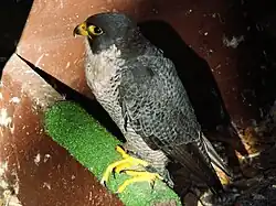 Le Faucon pèlerin (Falco peregrinus) est une espèce robuste de rapaces, de taille moyenne, réputée pour être la plus rapide du monde en piqué. Ses proies sont presque exclusivement des oiseaux, mais certains individus peuvent également s'attaquer à de petits animaux terrestres. Ce faucon ne construit pas de nid, et niche essentiellement sur des falaises, plus rarement sur des arbres, des structures ou des bâtiments élevés. Ses populations ont très fortement diminué après la Seconde Guerre mondiale, en particulier du fait de la pollution au DDT. Depuis sa protection dans les années 1970, ses populations sont à nouveau en expansion.