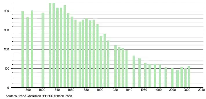 L'évolution du nombre d'habitants est connue à travers les recensements de la population effectués dans la commune depuis 1793. Pour les communes de moins de 10 000 habitants, une enquête de recensement portant sur toute la population est réalisée tous les cinq ans, les populations de référence des années intermédiaires étant quant à elles estimées par interpolation ou extrapolation[18]. Pour la commune, le premier recensement exhaustif entrant dans le cadre du nouveau dispositif a été réalisé en 2007[19].