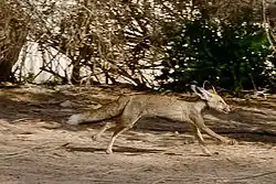 - Le renard roux d'Arabie (Vulpes vulpes arabica ; en arabe theeb) est plus svelte que son cousin européen. C'est le prédateur le plus répandu, y compris dans les décharges urbaines. Encore plus petites, deux autres espèces de renards vivent surtout la nuit, le renard famélique (Vulpes rueppellii, en anglais Sand Fox)[23] et le renard de Blanford (Vulpes cana).