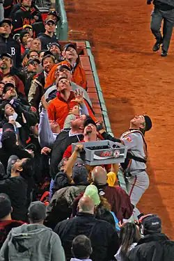 Un joueur en défense ne peut enregistrer un retrait s'il attrape une balle hors-jeu lorsqu'il se trouve dans l'un des abris des joueurs. Il peut s'en approcher et même attraper la balle au-dessus de l'abri, mais doit garder au moins un pied sur le terrain alors que l'autre pied ne se trouve pas dans l'abri. La même règle s'applique lorsque le joueur s'approche des gradins : il peut attraper la balle et permettre un retrait si la balle est au-dessus des spectateurs mais ne peut en aucun cas mettre un pied dans les estrades.