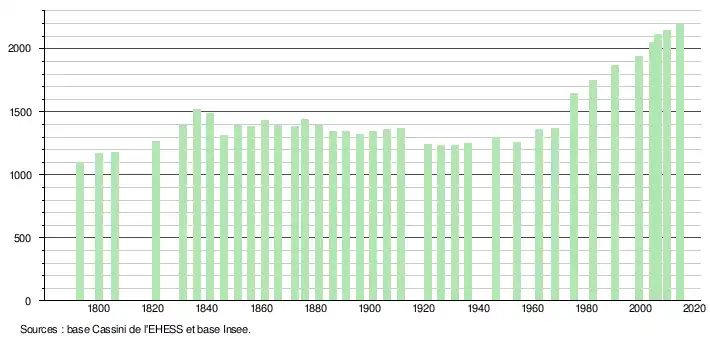 L'évolution du nombre d'habitants est connue à travers les recensements de la population effectués dans la commune depuis 1793. Pour les communes de moins de 10 000 habitants, une enquête de recensement portant sur toute la population est réalisée tous les cinq ans, les populations de référence des années intermédiaires étant quant à elles estimées par interpolation ou extrapolation[12]. Pour la commune, le premier recensement exhaustif entrant dans le cadre du nouveau dispositif a été réalisé en 2004[13].