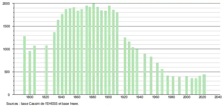 La commune a subi un siècle de déprise démographique ; elle comptait près de 2 000 habitants au début du XXe siècle[9] pour 366 aujourd'hui.
