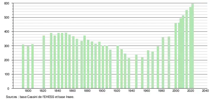 L'évolution du nombre d'habitants est connue à travers les recensements de la population effectués dans la commune depuis 1793. Pour les communes de moins de 10 000 habitants, une enquête de recensement portant sur toute la population est réalisée tous les cinq ans, les populations de référence des années intermédiaires étant quant à elles estimées par interpolation ou extrapolation[33]. Pour la commune, le premier recensement exhaustif entrant dans le cadre du nouveau dispositif a été réalisé en 2004[34].