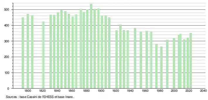 L'évolution du nombre d'habitants est connue à travers les recensements de la population effectués dans la commune depuis 1793. Pour les communes de moins de 10 000 habitants, une enquête de recensement portant sur toute la population est réalisée tous les cinq ans, les populations de référence des années intermédiaires étant quant à elles estimées par interpolation ou extrapolation[24]. Pour la commune, le premier recensement exhaustif entrant dans le cadre du nouveau dispositif a été réalisé en 2008[25].