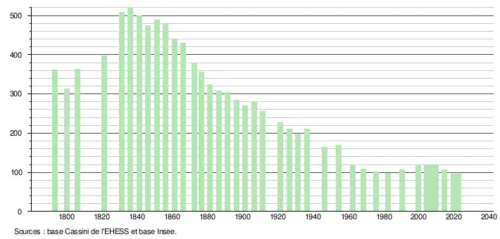 L'évolution du nombre d'habitants est connue à travers les recensements de la population effectués dans la commune depuis 1793. Pour les communes de moins de 10000habitants, une enquête de recensement portant sur toute la population est réalisée tous les cinqans, les populations de référence des années intermédiaires étant quant à elles estimées par interpolation ou extrapolation[16]. Pour la commune, le premier recensement exhaustif entrant dans le cadre du nouveau dispositif a été réalisé en 2004[17].