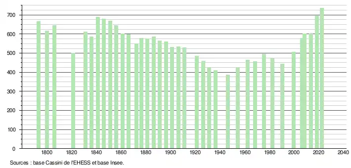 L'évolution du nombre d'habitants est connue à travers les recensements de la population effectués dans la commune depuis 1793. Pour les communes de moins de 10 000 habitants, une enquête de recensement portant sur toute la population est réalisée tous les cinq ans, les populations de référence des années intermédiaires étant quant à elles estimées par interpolation ou extrapolation[19]. Pour la commune, le premier recensement exhaustif entrant dans le cadre du nouveau dispositif a été réalisé en 2008[20].