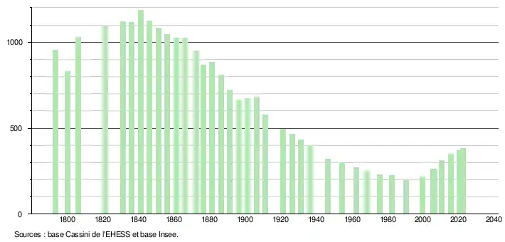 L'évolution du nombre d'habitants est connue à travers les recensements de la population effectués dans la commune depuis 1793. Pour les communes de moins de 10 000 habitants, une enquête de recensement portant sur toute la population est réalisée tous les cinq ans, les populations de référence des années intermédiaires étant quant à elles estimées par interpolation ou extrapolation[23]. Pour la commune, le premier recensement exhaustif entrant dans le cadre du nouveau dispositif a été réalisé en 2005[24].
