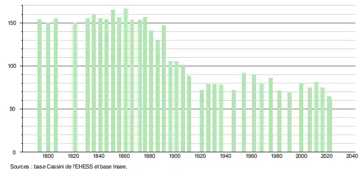 L'évolution du nombre d'habitants est connue à travers les recensements de la population effectués dans la commune depuis 1793. Pour les communes de moins de 10 000 habitants, une enquête de recensement portant sur toute la population est réalisée tous les cinq ans, les populations de référence des années intermédiaires étant quant à elles estimées par interpolation ou extrapolation[15]. Pour la commune, le premier recensement exhaustif entrant dans le cadre du nouveau dispositif a été réalisé en 2006[16].