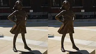 - ↑ (en) Emma Fierberg, « A $2.5 trillion asset manager just put a statue of a defiant girl in front of the Wall Street bull », Business Insider, (lire en ligne, consulté le )