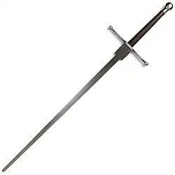 L'épée est constituée d'une lame à tranchant épais mais mince (pour ne pas alourdir la lame), avec un large ricasso évasé (aussi appelé schilt), d'une poignée lourde et d'un pommeau. Elle possède par conséquent un poids ainsi qu'un centre de masse identique à ceux d'une épée « réelle », et se manie de la même façon. Cette construction particulière a pour effet de déplacer le centre de percussion de l'épée vers un point virtuel situé au-delà de la pointe de l'arme. La pointe elle-même est aplatie, en forme de spatule, et pourrait avoir été recouverte d'une bande de cuir pour rendre l'assaut moins dangereux, encore qu'aucune preuve historique n'a été retrouvée à propos d'une telle pratique.