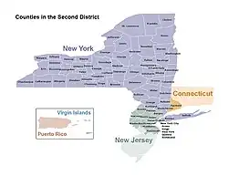 Elle est responsable de la deuxième circonscription de la Réserve fédérale, qui englobe l'État de New York, les douze comtés du nord du New Jersey, le comté de Fairfield dans le Connecticut, ainsi que Porto Rico et les îles Vierges des États-Unis.