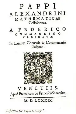 - Pappi Alexandrini Mathematicæ collectiones in latinum conversæ et commentariis illustratæ (1588), Pisauri, chez H. Concorde, trad. en latin et comm. par Commandin d’Urbino
