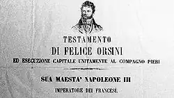 « J’adjure votre Majesté de rendre à l’Italie l’indépendance que ses enfants ont perdue en 1849, par le fait des Français (…). Que votre Majesté se rappelle que les Italiens, au milieu desquels était mon père, ont versé leur sang pour Napoléon le Grand, partout où il lui plut de les conduire ; qu’elle se rappelle que, tant que l’Italie ne sera pas indépendante, la tranquillité de l’Europe et celle de votre Majesté ne seront qu’une chimère : que votre Majesté ne repousse pas le vœu suprême d’un patriote sur les marches de l’échafaud ; qu’elle délivre ma patrie, et les bénédictions de 25 millions de citoyens la suivront dans la postérité. »