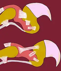 Les Machairodontinae, comme les genres Smilodon ou Homotherium dont les derniers représentants se sont éteints il y a environ 10 000 ans, probablement en raison de leur hyper-spécialisation[7] : l’étude de leur squelette révèle des lésions dues à l’extension ou à la flexion des attaches des muscles et des ligaments[8],[9].