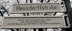 - À Bonn, où il a enseigné, une rue porte son nom, de même qu'un centre de recherches rattaché à l'université, le Centre Hausdorff pour les mathématiques[6].