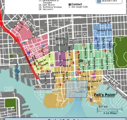 Situé à l'est de l'Inner Harbor et de Little Italy dans l'estuaire du Patapsco, Fells Point est un quartier portuaire reconverti et classé dans le Registre national des lieux historiques. Aujourd'hui, il est connu pour sa grande concentration de bars et de restaurants et attire de nombreux touristes.