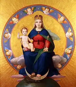 Dans la tradition catholique, cette femme fait donc principalement référence à Marie après son assomption. Cette tradition est réaffirmée par le pape Pie X[4], Paul VI[5] et Jean-Paul II[6]. Selon cette interprétation, l'« enfant mâle » est une référence à Jésus-Christ (Ap 12:5), qui doit « mener toutes les nations avec un sceptre de fer » (id.). Le dragon essayant de dévorer le nouveau-né au moment de sa naissance pourrait être, d'une part, une allusion à la tentative d'Hérode le Grand pour tuer l'enfant Jésus[7], et d'autre part à l'ensemble des chrétiens, enfants de l'Église, que Satan, jusqu'à la fin du monde, cherchera à perdre et à tuer spirituellement.