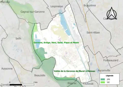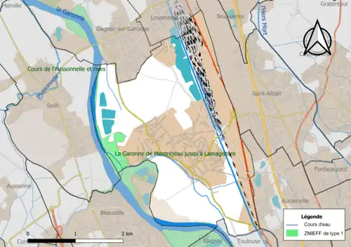L’inventaire des zones naturelles d'intérêt écologique, faunistique et floristique (ZNIEFF) a pour objectif de réaliser une couverture des zones les plus intéressantes sur le plan écologique, essentiellement dans la perspective d’améliorer la connaissance du patrimoine naturel national et de fournir aux différents décideurs un outil d’aide à la prise en compte de l’environnement dans l’aménagement du territoire. Une ZNIEFF de type 1[Note 3] est recensée sur la commune[23] : « la Garonne de Montréjeau jusqu'à Lamagistère » (5 075 ha), couvrant 92 communes dont 63 dans la Haute-Garonne, trois dans le Lot-et-Garonne et 26 dans le Tarn-et-Garonne[24] et une ZNIEFF de type 2[Note 4],[23] : « la Garonne et milieux riverains, en aval de Montréjeau » (6 874 ha), couvrant 93 communes dont 64 dans la Haute-Garonne, trois dans le Lot-et-Garonne et 26 dans le Tarn-et-Garonne[25].