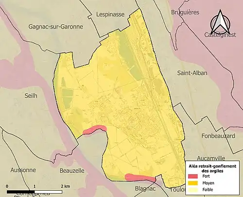La commune fait partie du territoire à risques importants d'inondation (TRI) de Toulouse, regroupant 15 communes concernées par un risque de débordement de la Garonne, un des 18 TRI qui ont été arrêtés fin 2012 sur le bassin Adour-Garonne[29]. Les événements significatifs passés sont la crue généralisée sur le bassin de la Garonne des 23 et 24 juin 1875 (7 500 m3/s à Toulouse), qui a fait 208 morts et détruit 1 219 maisons, et la crue des 1er au (3 300 m3/s) à Toulouse, qui a fait 7 victimes. Des cartes des surfaces inondables ont été établies pour trois scénarios : fréquent (crue de temps de retour de 10 ans à 30 ans), moyen (temps de retour de 100 ans à 300 ans) et extrême (temps de retour de l'ordre de 1 000 ans, qui met en défaut tout système de protection)[30]. La commune a été reconnue en état de catastrophe naturelle au titre des dommages causés par les inondations et coulées de boue survenues en 1982, 1999, 2000, 2009 et 2022[31],[27].