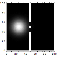 La figure ci-contre montre l'évolution de la fonction d'onde d'un électron au passage des deux fentes. Les niveaux de gris représentent la densité de probabilité de présence de l'électron. La taille réelle de l'électron est en fait bien plus petite que sa zone de probabilité de présence (en forme de cercle) initiale. On voit nettement que l'électron « interfère avec lui-même » : les franges d'interférences sont bien visibles aux sorties des deux fentes (l'électron possède aussi une certaine probabilité de « rebondir » et de former également une figure d'interférence vers l'arrière).