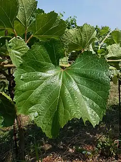 Les feuilles adultes sont cunéiformes à réniformes, entières, avec un limbe involuté, un sinus pétiolaire en U ouvert et des dents courtes par rapport à leur largeur.
